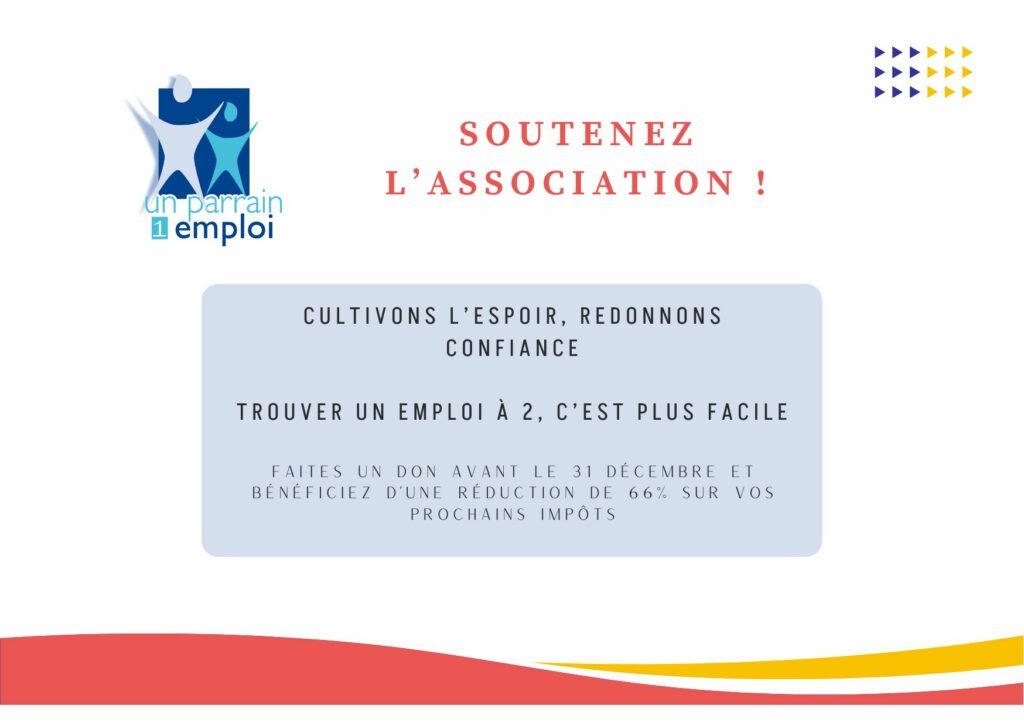 Chaque jour, notre association s’engage pour aider les personnes les plus éloignées de l’emploi à s’insérer professionnellement. Notre travail a un impact concret et positif et il est possible grâce à vous. Faire un don, est un acte nous permettant directement d’accompagner davantage de chercheurs d’emploi, de former nos bénévoles et nos chargées de mission !